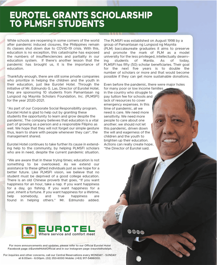 While schools are reopening in some corners of the world after pandemic induced closures, the Philippines remain its classes shut down due to COVID-19 crisis. With this, education is no exception, this catastrophe has exposed the numbers of insuffienciencies and partiality in our education system. If there’s another lesson that the pandemic has brought us, it is the importance of education. Thankfully enough, there are still some private companies who prioritize in helping the children and the youth in their education, just like Eurotel Hotel. Through the initiative of Mr. Edmundo G. Las, Director of Eurotel Hotel, they are sponsoring 10 students from Pamantasan ng Lungsod ng Maynila Scholars Foundation, Inc. (PLMSFI) for the year 2020-2021. “As part of our Corporate Social Responsibility program, Eurotel Hotel is glad to help out by granting these students the opportunity to learn and grow despite the pandemic. The company believes that education is a vital part of growing as a person and a responsible Filipino as well. We hope that they will not forget our simple gesture thus, learn to share with people whenever they can”, the management shared. Eurotel Hotel continues to take further its cause in extending help to the community, by helping PLMSFI scholars who are in need, despite the current pandemic situation. “We are aware that in these trying times; education is not something to be overlooked. As we extend our assistance to these gifted individuals just as we hope for a better future. Like PLMSFI vision, we believe that no student must be deprived of a good college education. There is an old Chinese proverb that goes, “If you want happiness for an hour, take a nap. If you want happiness for a day, go fishing. If you want happiness for a year, inherit a fortune. If you want happiness for a lifetime, help somebody, and true happiness are found in helping others.” Mr. Edmundo added. The PLMSFI was established on August 1998 by a group of Pamantasan ng Lungsod ng Maynila (PLM) baccalaureate graduates it aims to preserve and promote the mark of PLM as a model university for the less privileged, intellectually deserving students of Manila. As of today, PLMSFI has fifty (50) scholar beneficiaries. Their goal for the next five years is to double the number of scholars or more and that would become possible if they can get more sustainable donations. “Even before the pandemic, there were major holes for many poor or low income families in the country who struggle to pay tuition fee for schools and lack of resources to cover emergency expenses. In this time of pandemic, all we need is care. We need more sensitivity. We need more people to care about one another; we should not let this pandemic, driven down the will and eagerness of the children and the youth to brighten up their education. Actions can really create hope,” the Director of Eurotel said. For more announcements and updates, please refer to our Official Eurotel Hotel Facebook page @EurotelHotelOfficial and in our Instagram page @eurotelhotelph. For inquiries and other concerns, call our Central Reservations every MONDAY - SUNDAY at 6:00am - 6:00pm. (02) 353-6000 Mobile: (+63) 917-5486000.