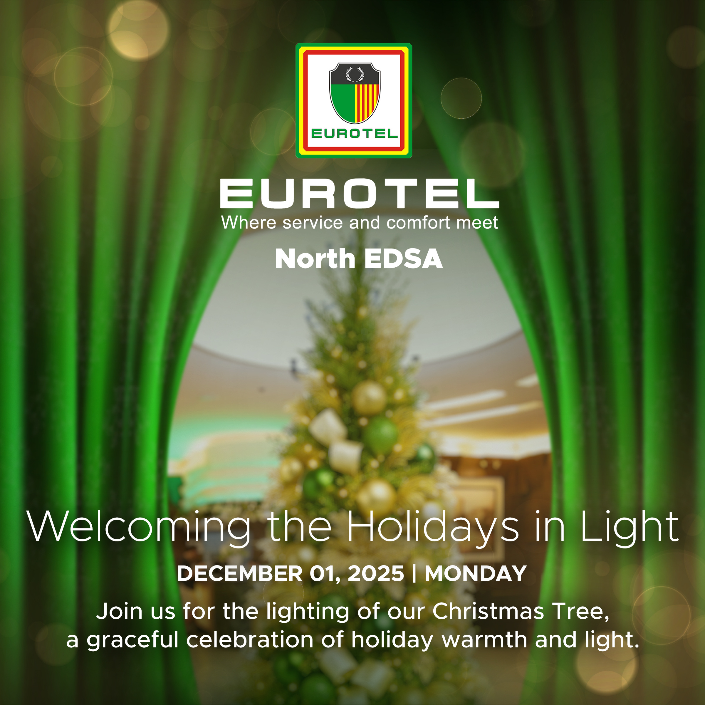 Eurotel North EDSA Branch warmly invites guests, partners, and the community to gather for its annual Christmas Tree Lighting on December 1, 2025. This year’s theme, “Welcoming the Holidays in Light,” reflects the branch’s dedication to offering warmth, comfort, and festive cheer to every visitor. The ceremony will showcase Eurotel North EDSA’s beautifully adorned Christmas Tree—glowing in rich green and gold hues and symbolizing hope, gratitude, and the joy of the season. Join us for an evening of elegance and heartfelt celebration as Eurotel North EDSA Branch officially ushers in the Christmas spirit.